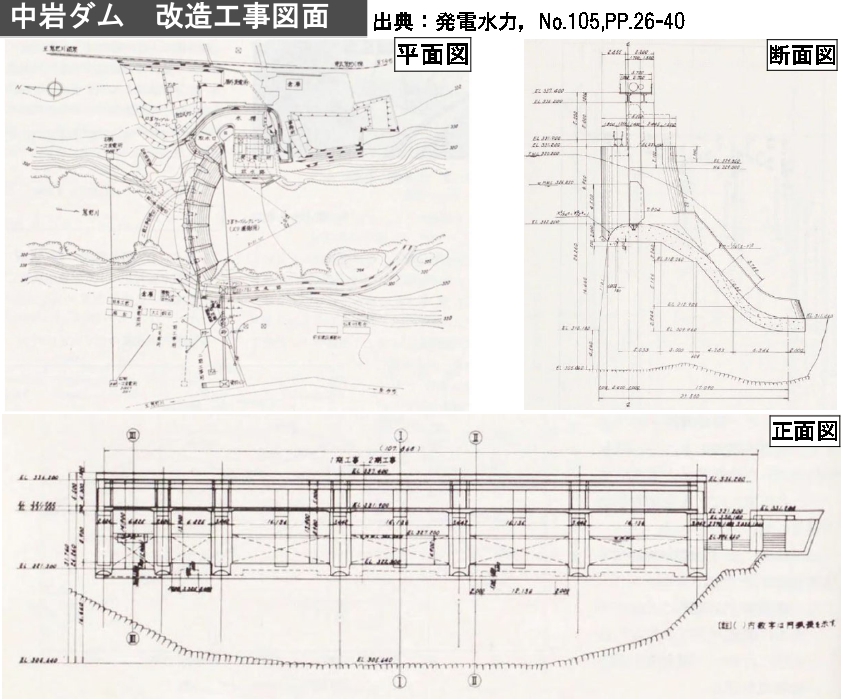 • 認定理由:中岩ダムは、鬼怒川水力電気によって大正期に建設された曲線形重力式ダムの早期の事例で、滑らかな湾曲線が美しい土木遺産です。